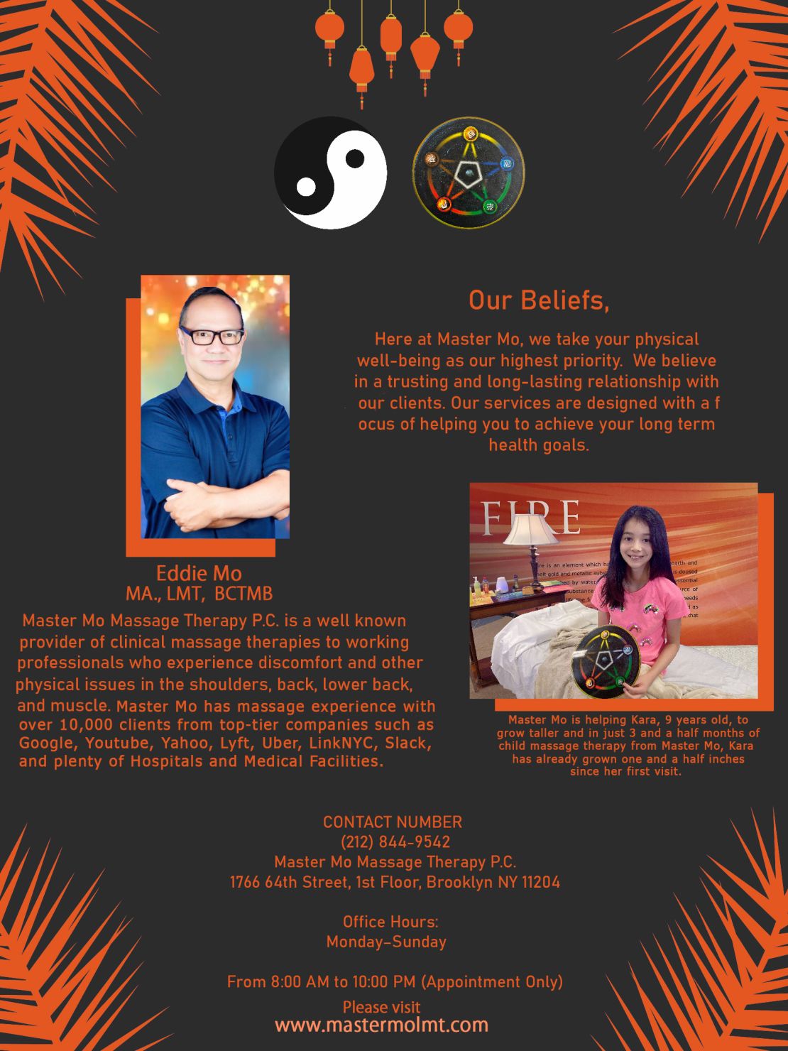 *Master Mo Massage Therapy P.C. is a well known-provider of clinical massage therapies to working professionals who experience discomfort and otherphysical issues in the shoulders, back, lower back,and muscle. Master Mo has massage experience with over 15,000 clients from top-tier companies such as Google, Youtube, Yahoo, Lyft, Uber, LinkNYC, Slack, Colgate Palmolive, CityMD Urgent Care , Cornell Tech, and plenty of Hospitals and Medical Facilities.